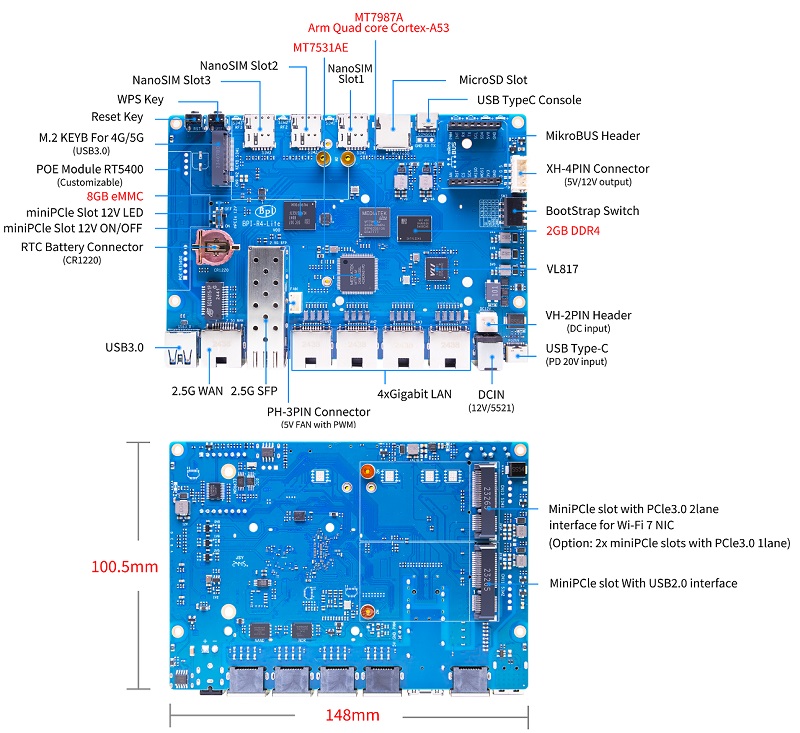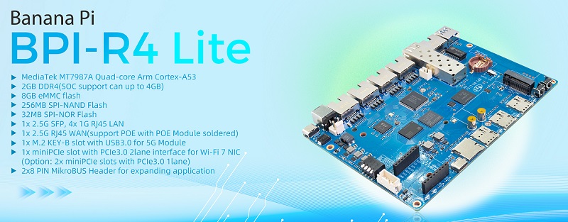 Banana Pi BPI-R4 Lite 智能路由器板采用联发科MT7987A四核Arm Cortex-A53芯片设计,板载支持2GB DDR4和8G eMMC 存储。支持1个2.5G SFP光口和1个2.5G RJ45 WAN口,支持4个1G RJ45 LAN接口。支持M.2接口,可以扩展 4G/5G模块。1x miniPCIe插槽,PCIe3.0 2lane接口,用于Wi-Fi 7无线网卡。