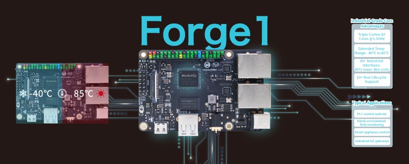 Banana Pi BPI-Forge1采用瑞芯微RK3506J工业级芯片设计。RK3506J是一款高性能的三核Cortex-A7应用处理器,专为智能语音交互、音频输入/输出处理、图像输出处理和其他数字多媒体应用而设计。 嵌入式2D硬件引擎和显示输出引擎,用于最小化CPU开销以满足图像显示要求。 嵌入丰富的周边接口,如SAI、PDM、SPDIF、Audio DSM、Audio ADC、USB2 OTG、RMII、CAN等,可以满足不同的应用开发需求,减少硬件开发复杂性和开发成本。